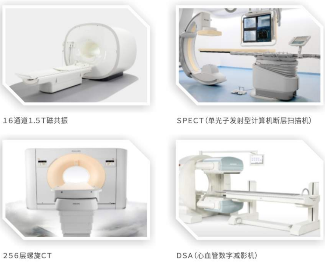 医院配置有一体化正电子发射型计算机断层成像仪/磁共振成像仪(PET/MR)、先锋256能谱CT、IGS极光(微剂量全兼容血管造影系统)等大中型医疗设备。