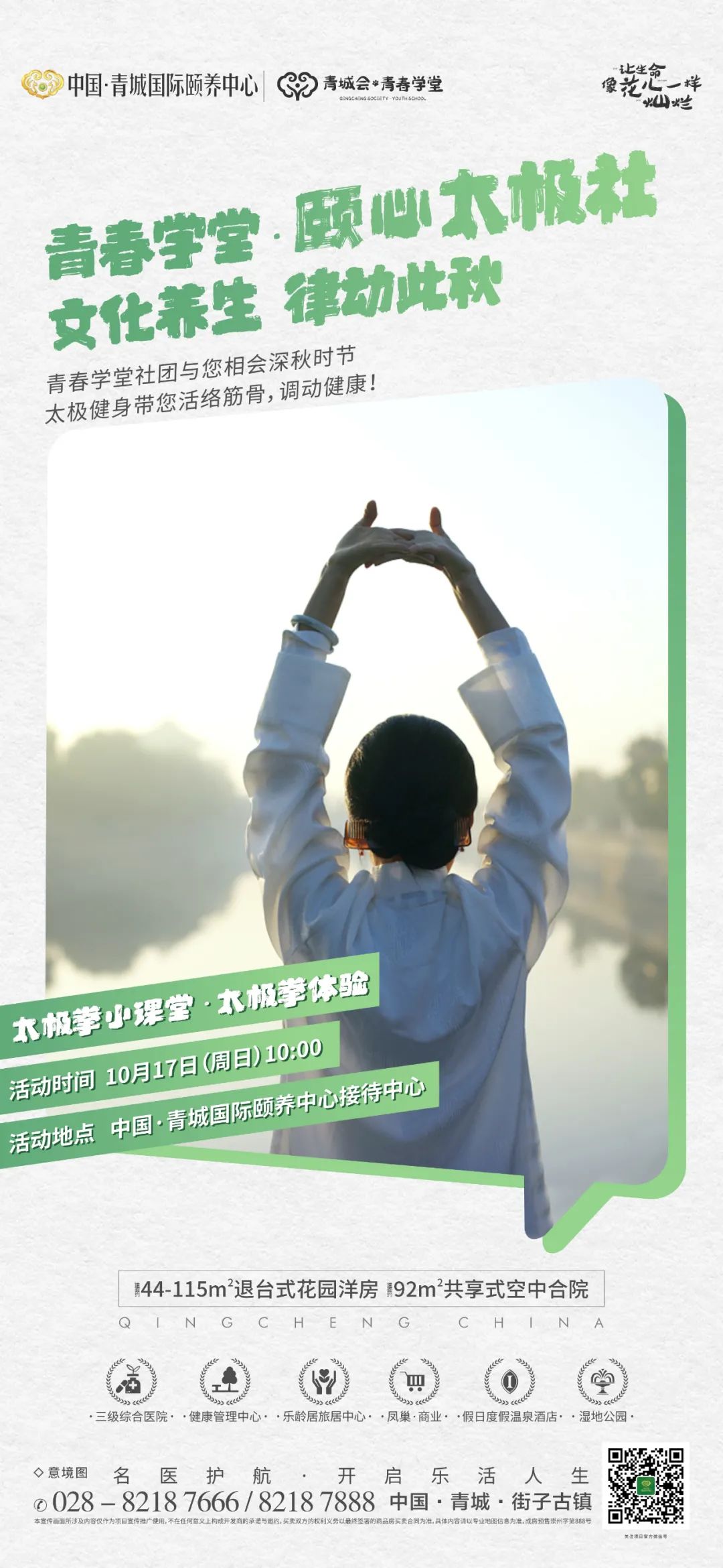 实拍图实拍图会·青春学堂现已依据业主们的不同兴趣爱好,组建了六大社团,分别为留声合唱社、清影舞蹈社、行云书法社、颐心太极社、晴里健身球社、牛仔器乐社。后期我们还将不断组织与创建更多主题的社团,敬请期待。同时,每周我们都将推出全新的主题活动,如果您也想与好友们分享喜悦心情、体会纯粹美好的后青春生活,那么加入青城会·青春学堂吧!与我们相会于青城山下,期待与您共演动人时光!